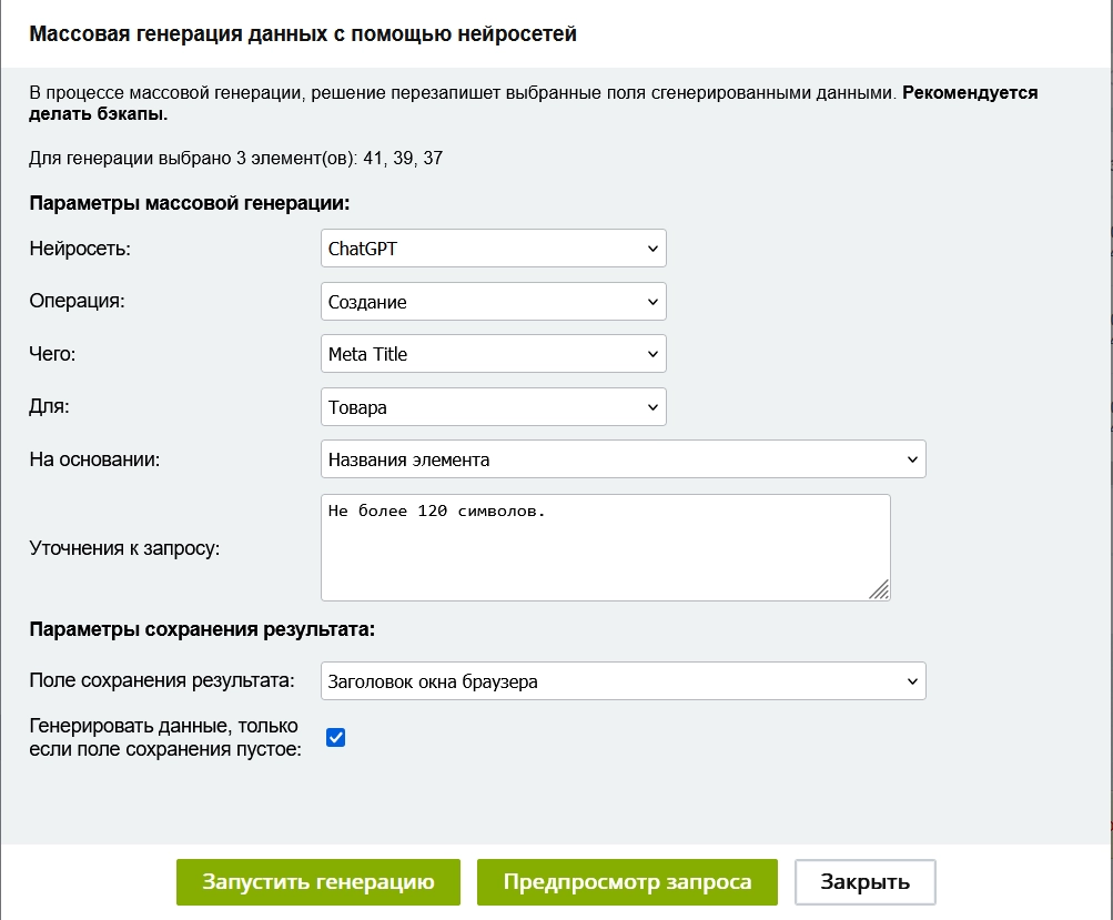 Перед использованием массовой генерации, рекомендую поработать с генерацией данных для отдельных элементов. Так вы лучше поймете как работает генерация, что отвечают нейросети, потренируетесь в подборе промптов под нужный результат.