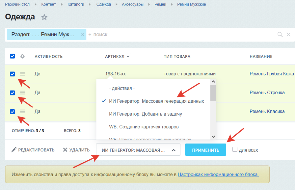 Для массовой генерации данных перейдите в список разделов или элементов инфоблока. Выберите элементы с которыми хотите работать, в меню действия выберите "ИИ Генератор: Массовая генерация данных", нажмите применить