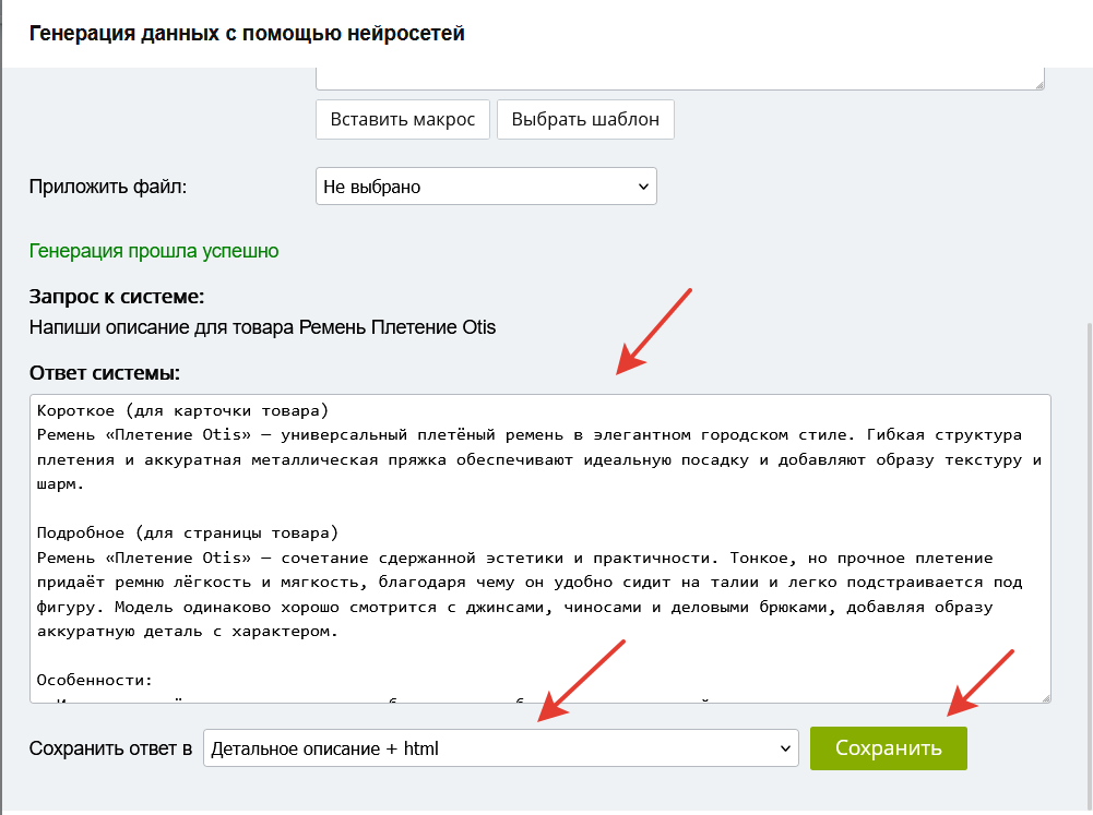 После того как мы проверили ответ, внесли корректировки при необходимости, выбираем поле куда нужно сохранить сгенерированные данные и нажимаем сохранить.
