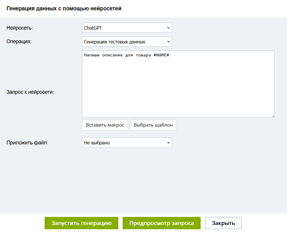 При нажатию на которую открывается окно генерации данных. В данном окне мы можем увидеть мы указываем параметры генерации: Нейросеть, Тип операции и дополнительные параметры характерные для конкретного типа операции (например для генерации своим шаблоном мы пишем промпт, для генерации по конструктору выбираем что мы хотим сгенерировать и на основании чего и т.п.)