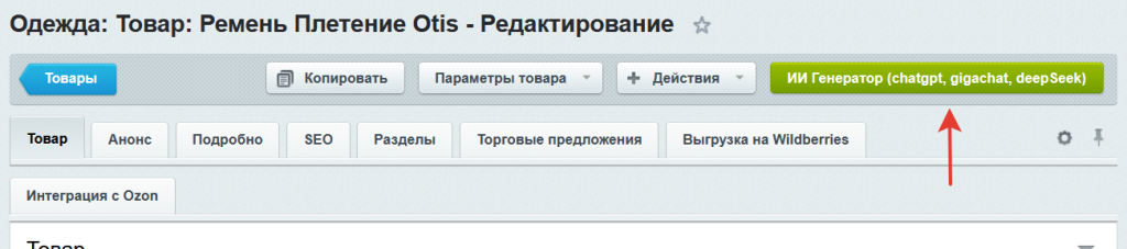 После установки и настройки решения, при редактировании элемента или раздела в административной панели битрикса появится кнопка "ИИ Генератор"