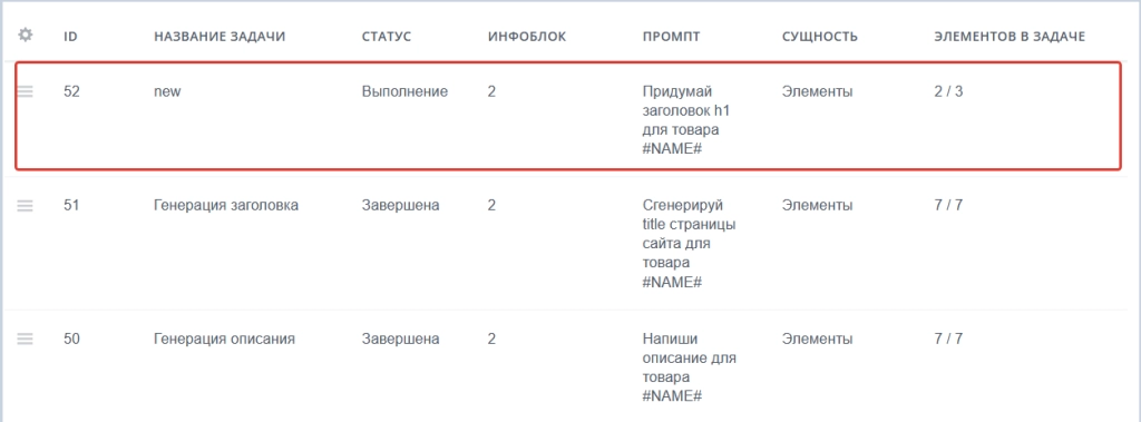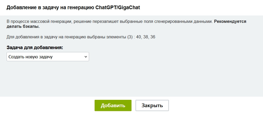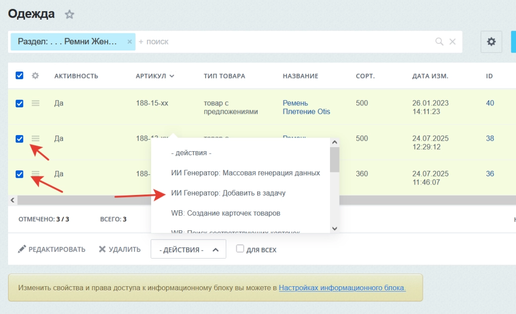 Начинать создание задачи рекомендую с элементов. Переходим в список элементов инфоблока, выделяем нужные элементы и выбираем в списке действий "ИИ Генератор: Добавить в задачу". Нажимаем применить.