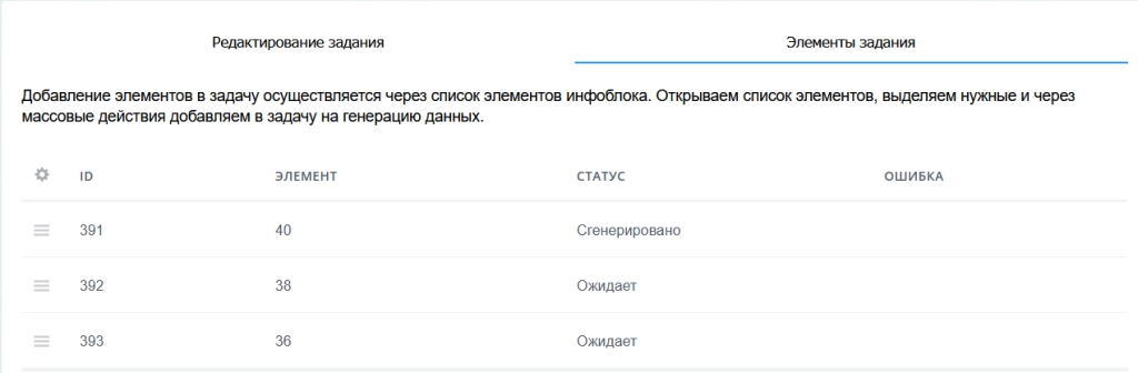 После того как задача пройдет все элементы она перейдет в статус Завершена. Если решение столкнется с ошибками в процессе генерации задача перейдет в ошибочный статус.
