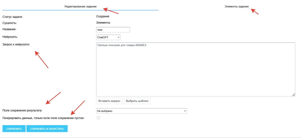 Интерфейс задачи достаточно простой, состоит из двух вкладок: параметры генерации и списка элементов этой задачи. После перехода в новую задачу обязательно заполните основные поля: Нейросеть, Запрос к нейросети, Поле сохранения результата. Сходите на вкладку "Элементы задания" и убедитесь что выбраны нужные элементы.