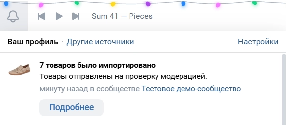 6. Ждём модерацию, после модерации товары начнут появляться в сообществе, возможно порционно (у меня после загрузки из 7 отображало 5 товаров, но если поменять сортировку начинало отображать все 7).
