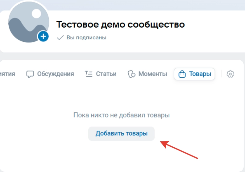 3. Если у вас в сообществе добавлено 0 товаров добавляем любой тестовый товар, просто что бы появилась кнопка все товары, при переходе на по которой можно будет указать ссылку на фид.