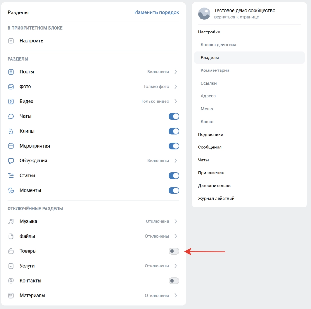 Если у вас уже включен блок товары, переходим к следующему шагу. Если блок товары не отображается - включаем отображение товаров в управлении сообществом.