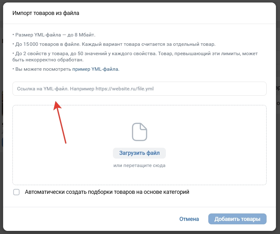 В открывшемся окне указываем ссылку на фид и нажимаем Добавить товары